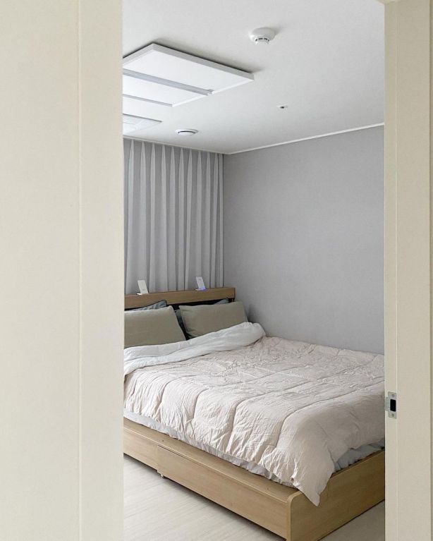 主臥空間適合大人居住,還是喜歡這種簡單舒適的布局。灰色的墻面搭配灰色的窗簾。木質(zhì)床鋪配上棉質(zhì)床單,看起來非常干凈。難怪別人都說再過10年也是流行。