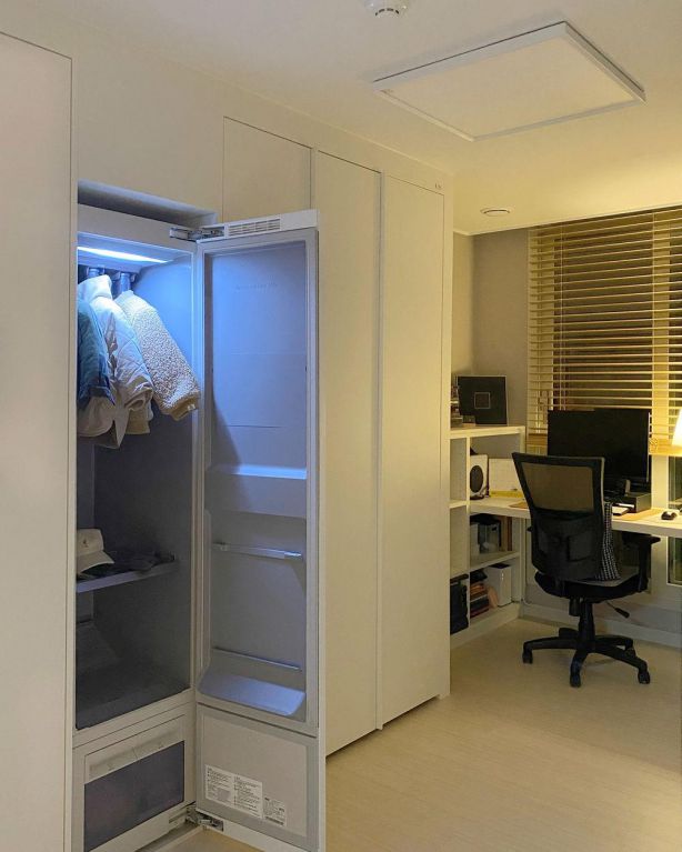 陽臺(tái)空間被改成了洗衣房使用,利用側(cè)邊打造到頂?shù)墓耋w,可以嵌入洗衣機(jī)、烘干機(jī)等物品。吊柜側(cè)邊留空一部分,還可以把洗衣液通通塞進(jìn)去。