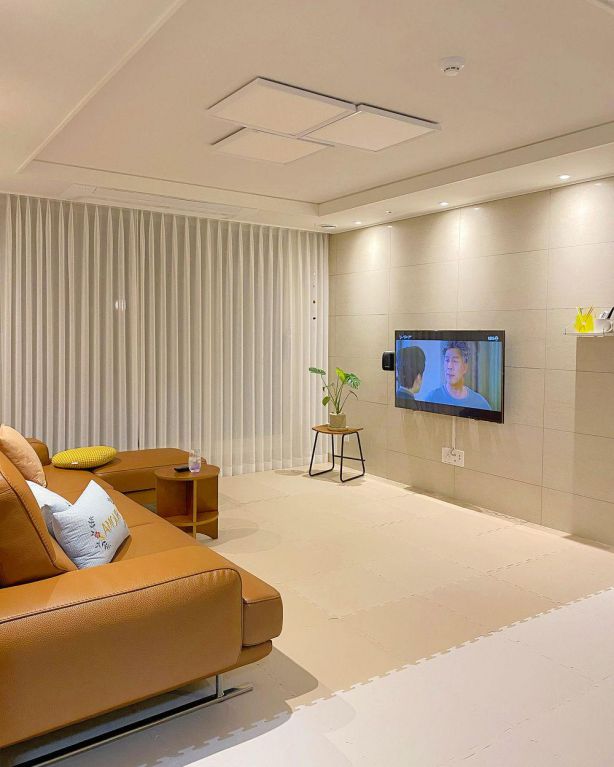客廳空間比較簡單,沒有多少物品,只有簡單的電視、沙發(fā)和茶幾布局,東西越少反而顯得更加精致。深橘色沙發(fā)和暖色系的瓷磚搭配,又復(fù)古又干凈。摒棄滿墻柜體,掛放電視,并給旁邊墻面安排一個(gè)置物架就搞定。
